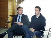 前半は、イギリス出身のジェイムス・アーンショウ(英会話講師) が今治に来てから習い始めた空手をとおして、母国との文化の相 違点を独自の視点で語ってくれました。友人のスチュアート・アダムスが流ちょうな日本語で通訳をし、息のあった二人の絶妙な コンビぶりに、参加者はすっかり魅了されました。
